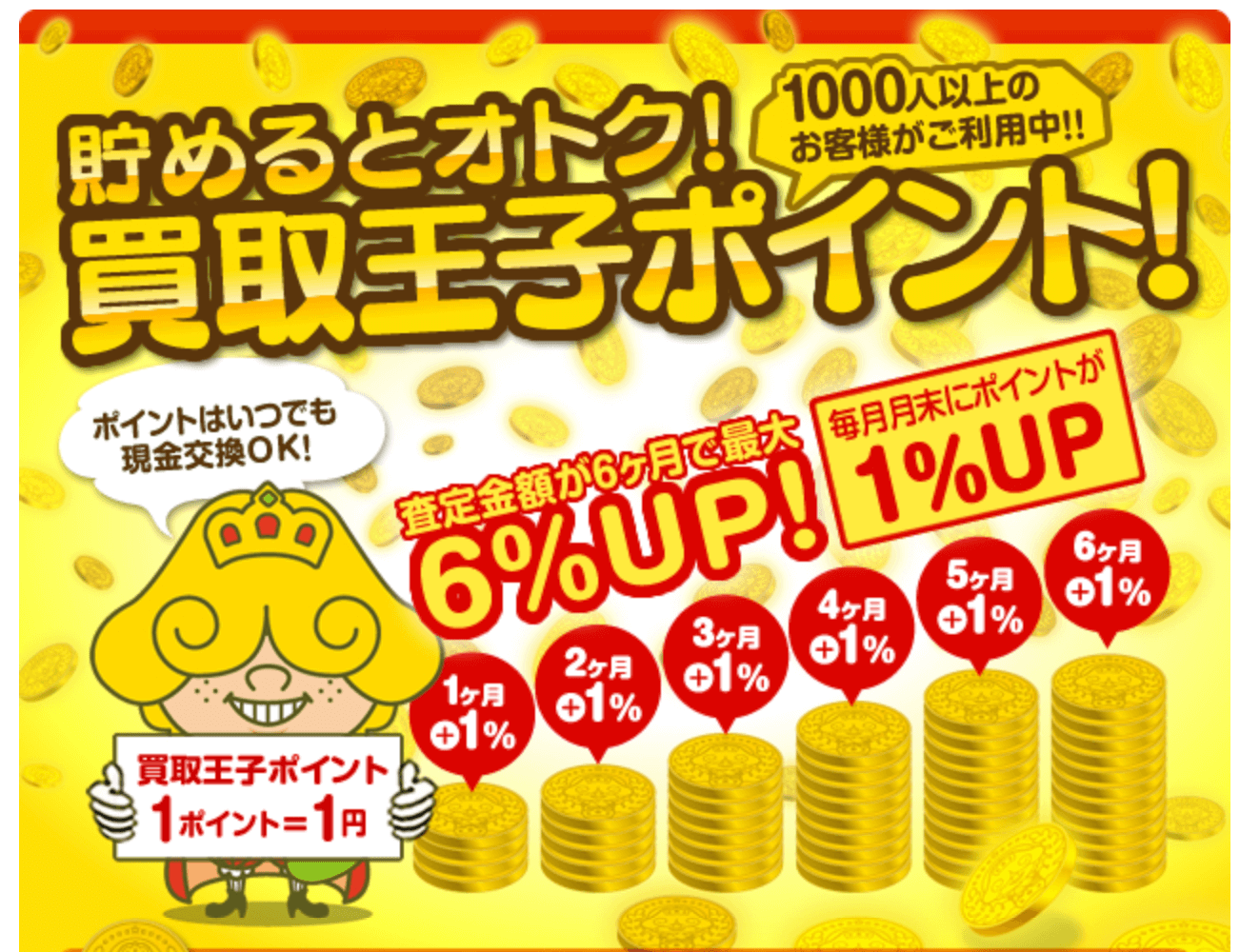 買取王子ポイントは、1ポイント1円であり、6か月後までに毎月ポイントが1%ずつ増えていく仕組みになっています。そのため、例えば1万円で買取してもらった場合にもらえる1万ポイントは、半年後には1万600ポイント(1万600円分)になっています。